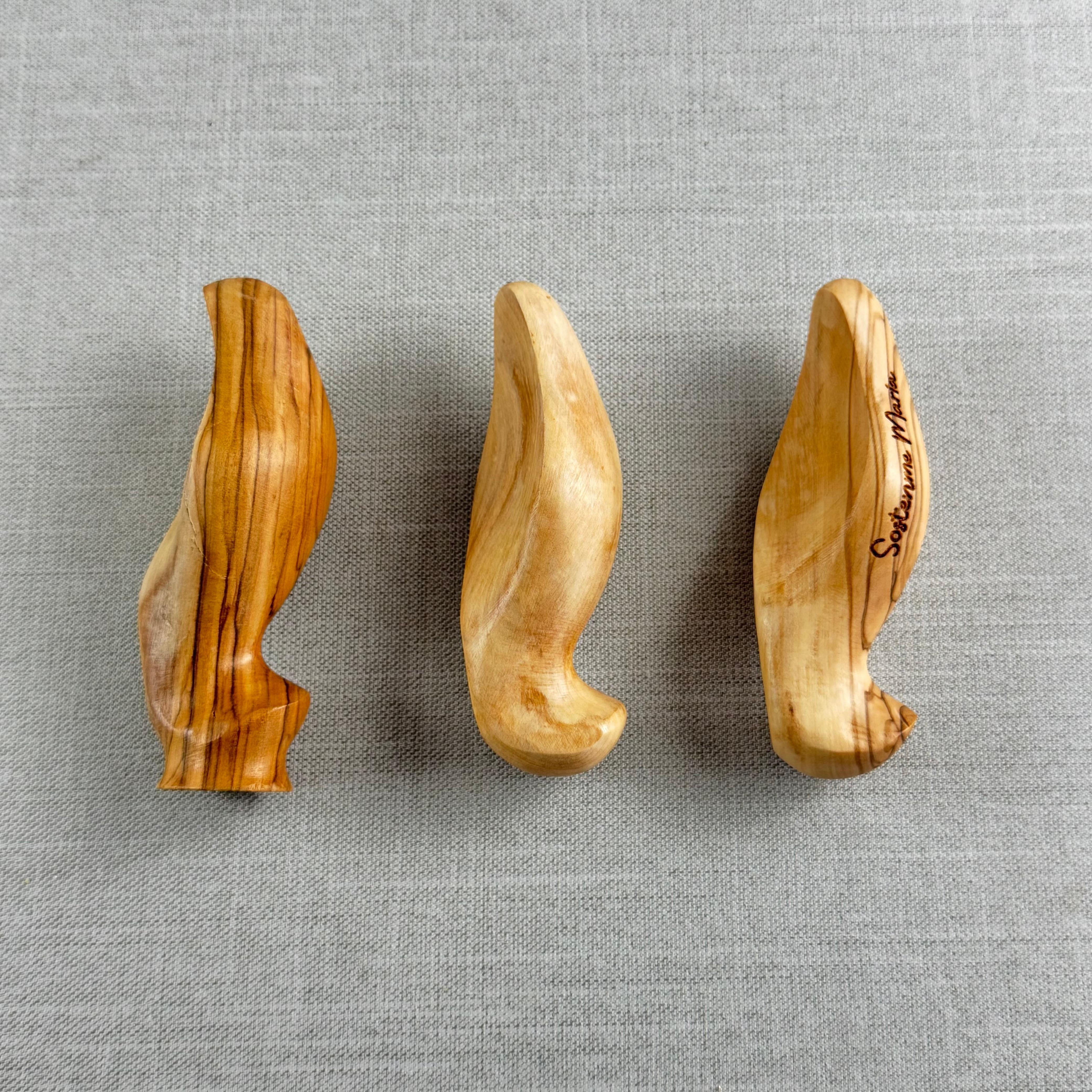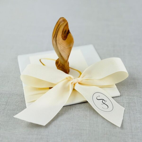 Handheld Virgin crafted from olive wood, brought from the Holy Land. Ideal for personalization with an engraved name.